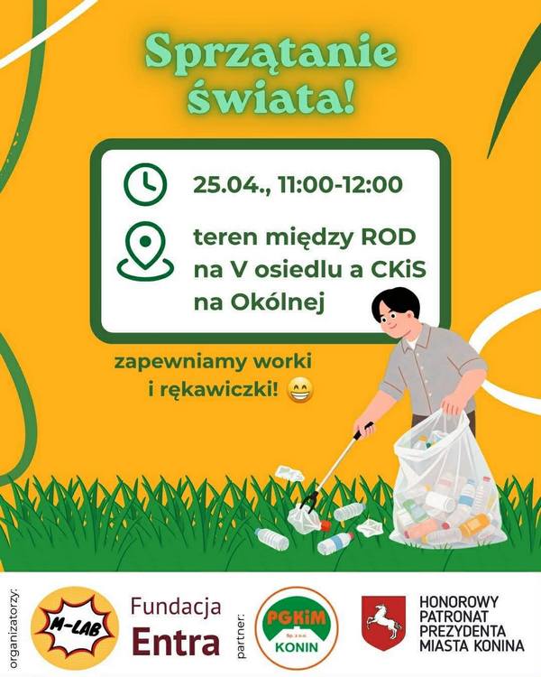 INFORMACJE Będą sprzątać na V osiedlu! 24 kwietnia 2026 redakcja inicjatywa, PGKiM Konin, Sprzątanie świata W sobotę w godzinach 11.00-12.00 odbędzie się akcja sprzątania świata, może chcesz dołączyć? Zapewniają worki i rękawiczki! Źródło informacji: PGKiM Sp. z o. o. w Koninie Udostępnij na: