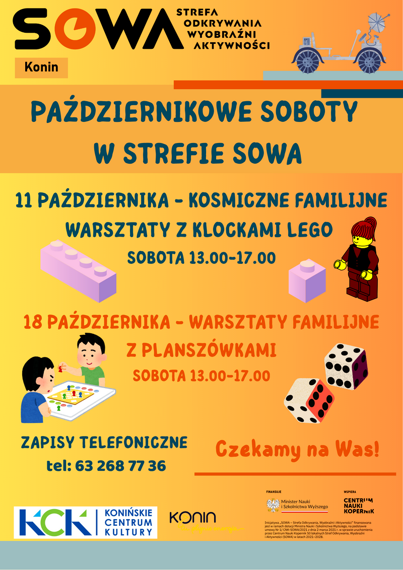 Pierwsze warsztaty, te z LEGO, rozpoczną się 11 października o 13.00. Dzieci i rodzice będą wspólnie składać modele pojazdu księżycowego. Na drugie spotkanie w SOWIE zapraszamy w kolejną sobotę, 18 października, również na 13.00. Jeśli lubicie gry planszowe, to propozycja dla Was. Prosimy o telefon pod nr 63 268 77 36. Na miejscu będzie można dowiedzieć się, jak działa projekt, zwiedzić salę z eksponatami i poznać lepiej to miejsce. Patronami Strefy Aktywności Odkrywania, Wyobraźni i Aktywności jest Centrum Nauki Kopernik i Minister Nauki oraz projektem naukowym adresowanym do najmłodszych realizowanym przez Konińskie Centrum Kultury i Miasto Konin.
