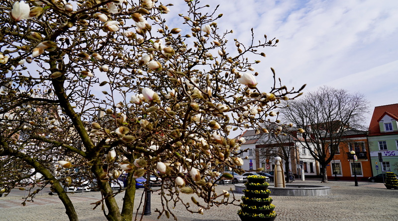 Jeśli lubicie poszukać oznak wiosny warto się wybrać na Plac Zamkowy, zaczęły pięknie kwitnąć magnolie. Grube pąki kwiatowe strzelają, nie