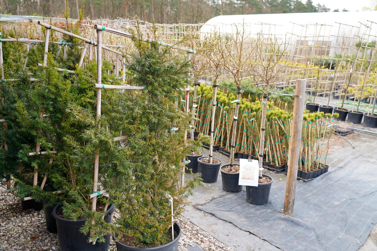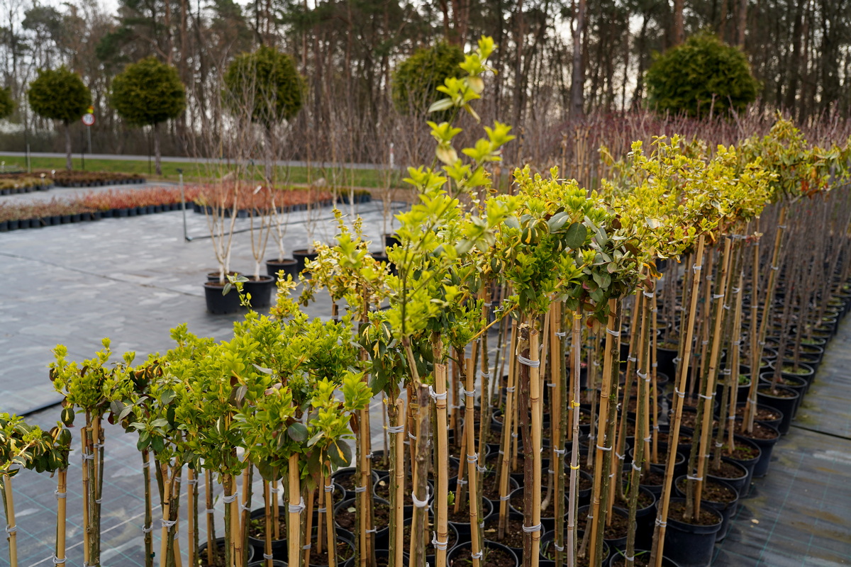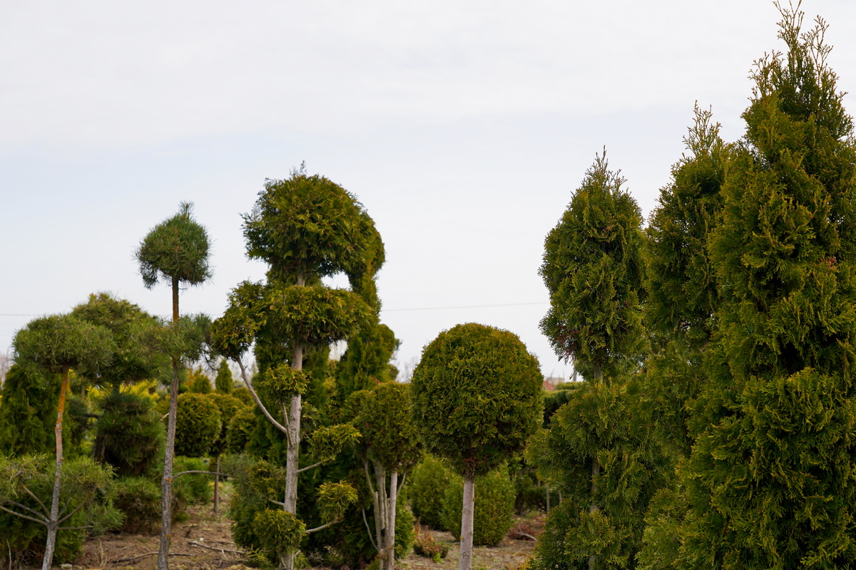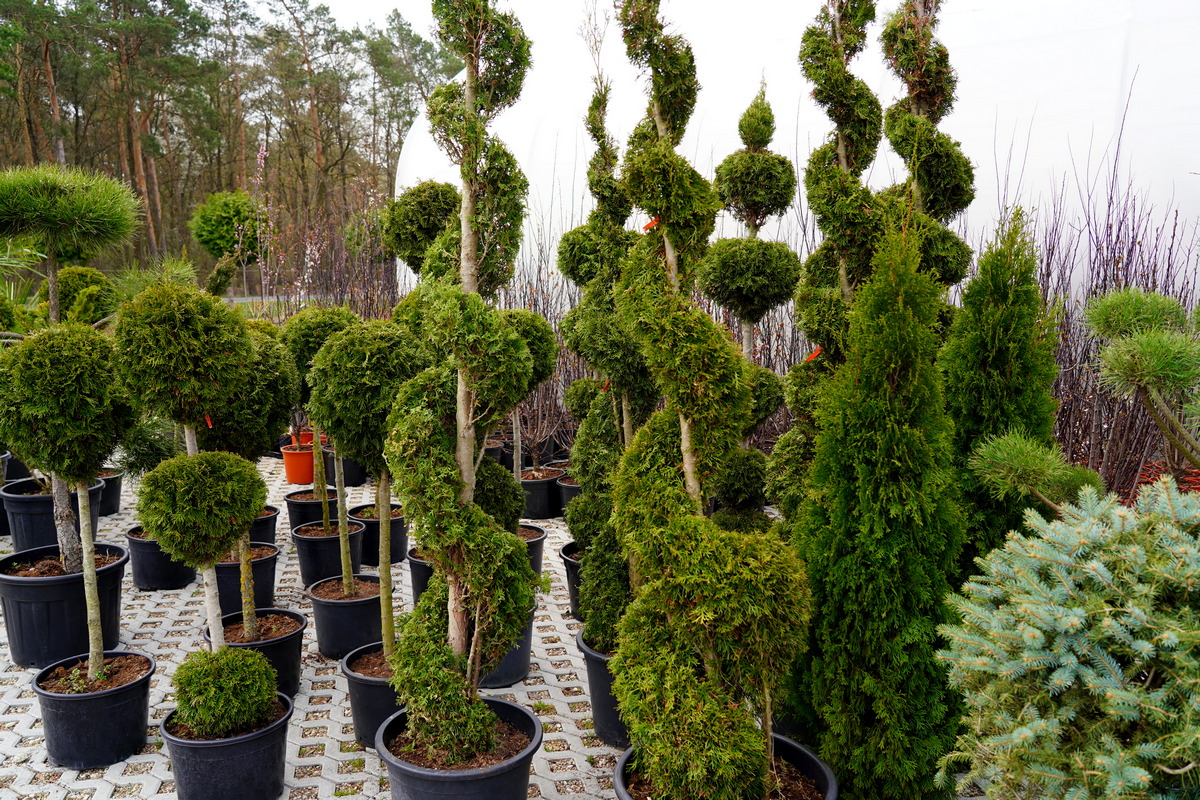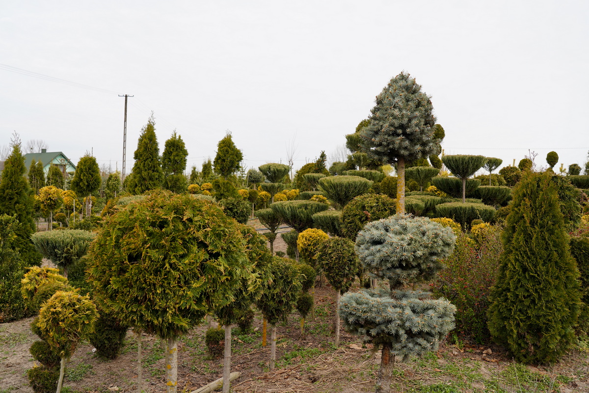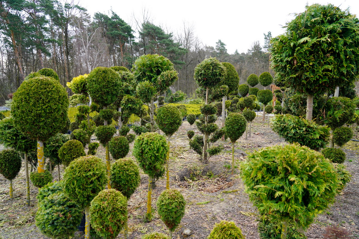 Róże pienne, ambrowce kuliste, kolumnowe i w formie drzewa, miskanty Memory, berberysy Orange Ice i Green Carpet, tuje Danica i Miriam, modrzewie japońskie, jałowce blue Chip, blue Star, procumbensy nana, laurowiśnie Novita, jest tego mnóstwo! Wierzba Hakuro Nishiki i Kilmarnock, różaneczniki na pniu, jeśli szukacie egzotyki to też Was nie zawiodą, mają piękne palmy i sporych rozmiarów drzewa oliwne.